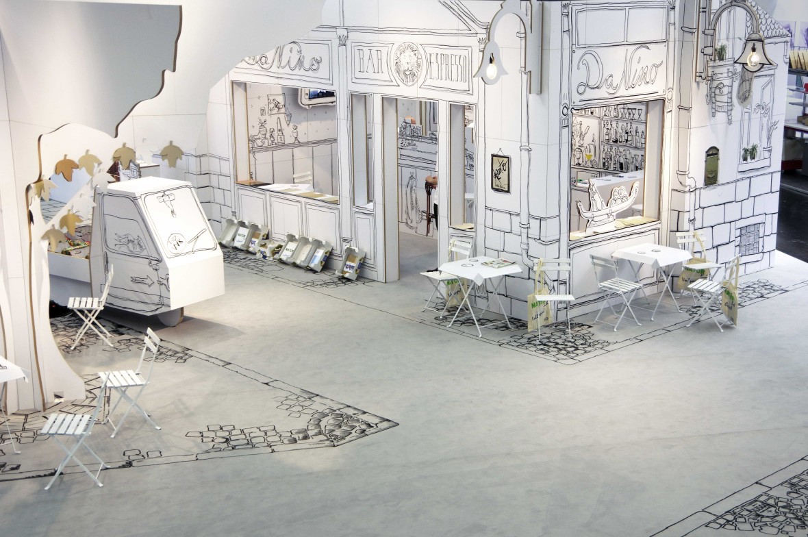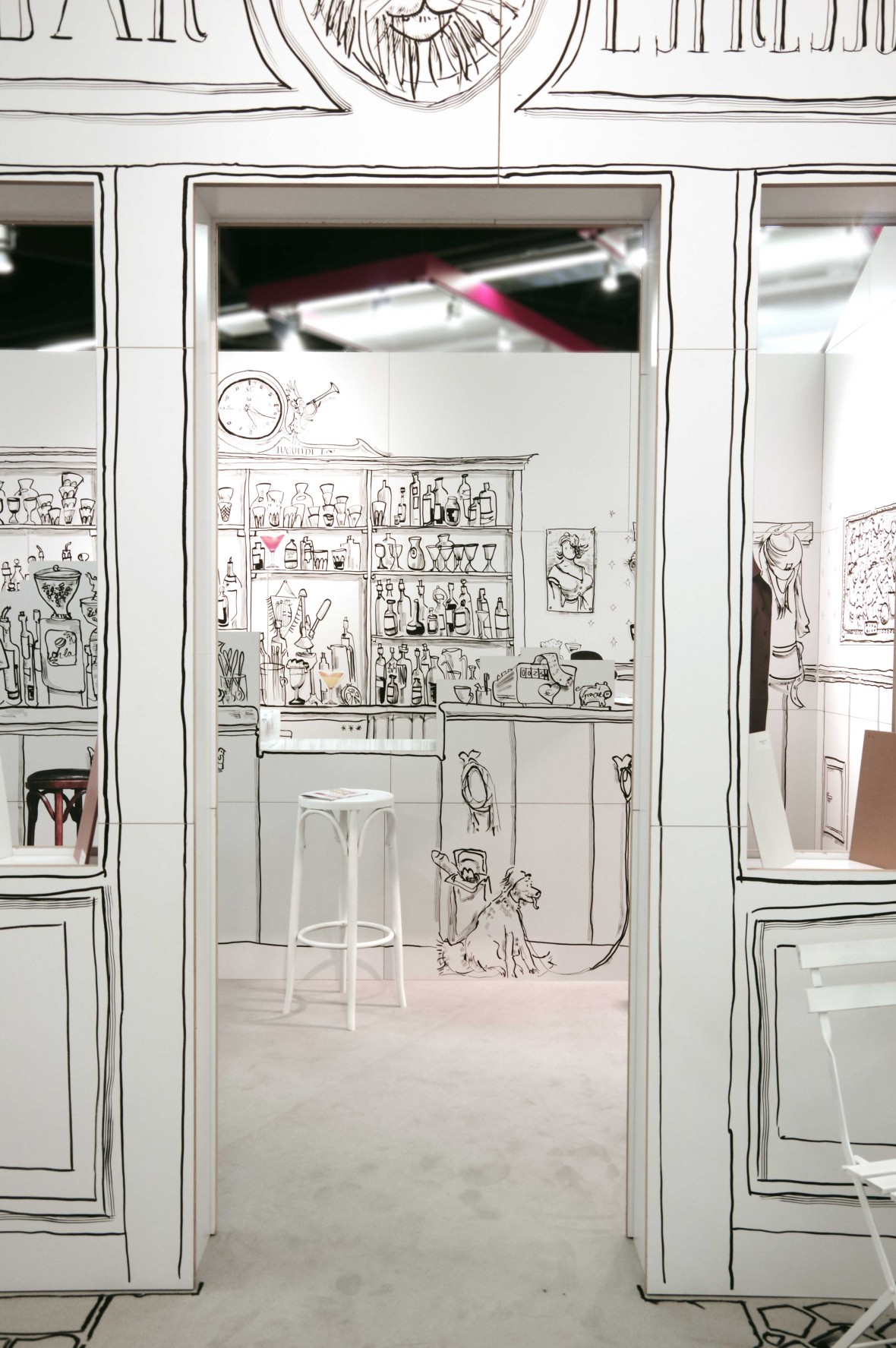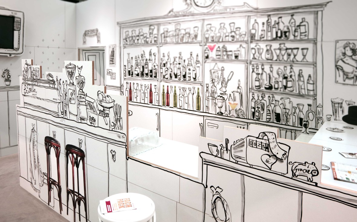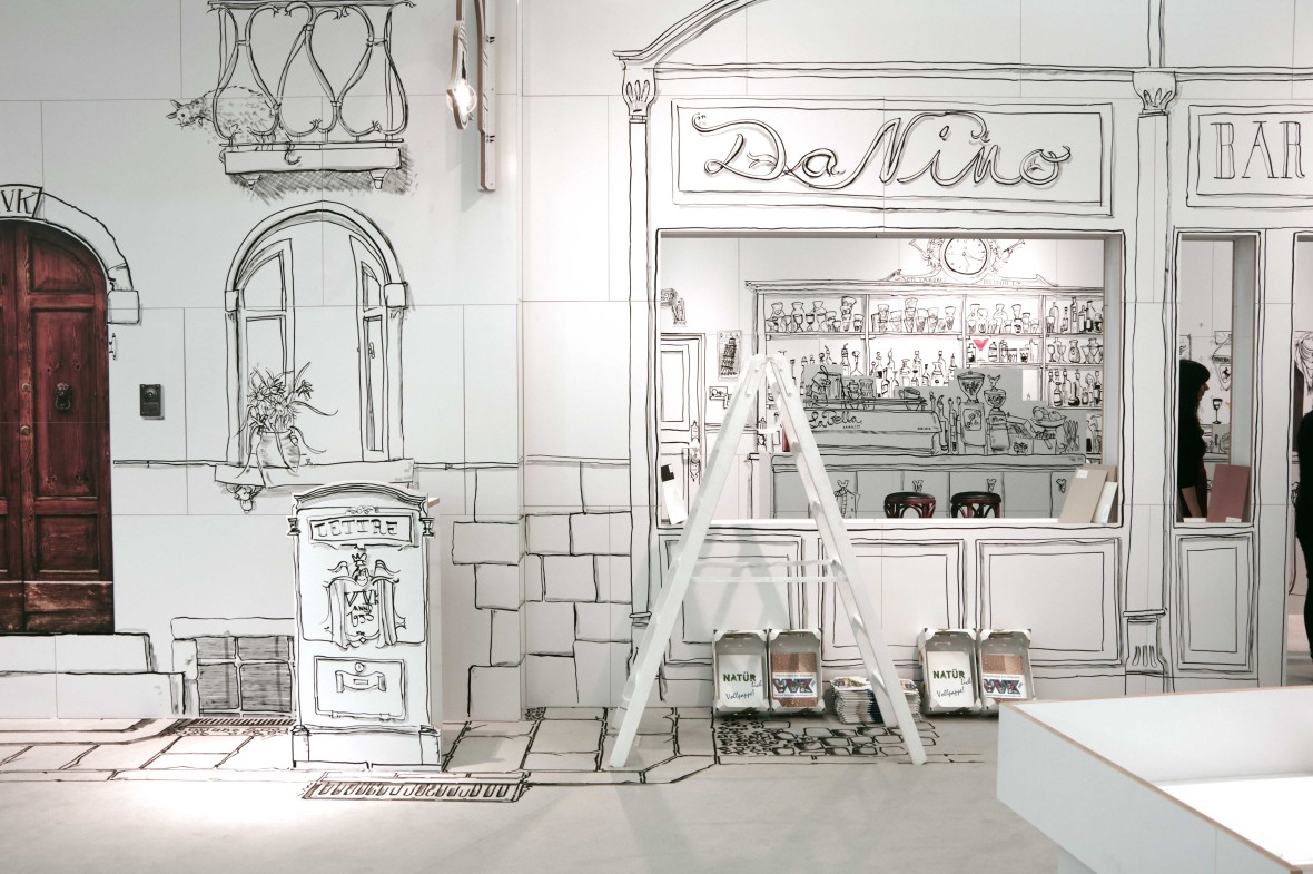 Zwischen Planung und Improvisation wurden die Zeichnung auf Boden und Wand aufgebracht. Grundlage dieser Schritt für Schritt entstehenden Welt sind hochauflösende Bilder von realen Einzelelementen, die durch die Zeichnung eingebettet werden und stilisierten Fassaden von Gebäuden und Innenräumen entstehen lassen. Die Gestaltung des Standes basiert auf weißen, seidenmatten Flächen, deren Kontrast zu farbigen Bildern und der schwarzen Zeichnungsgrafik, die mit Acrylmarkern per Hand aufgetragen wurden.